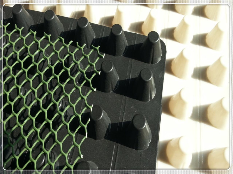 利用工藝壓型在土工膜上壓出封閉突起的圓臺狀、柱狀、球冠狀殼體,形成的一種膜、殼連續,具有立體空間和一定支撐剛度。結合表面鋪貼的無紡土工布濾水層。構架出架空層,利用架空層形成排水、排氣通道,同樣利用架空層達到隔音、隔振的功能。
